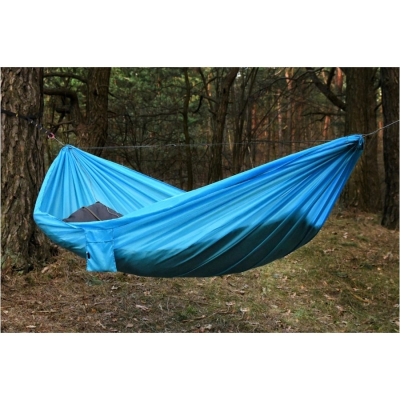 Hamak TigerWood Sky Version został wykonany na bazie nylonowej tkaniny łączącej w sobie wszystkie cechy, których oczekujemy podczas nocowania w terenie. Materiał charakteryzuje się wysoką odpornością na rozciąganie, dzięki czemu bez problemu utrzyma ciężar do 200 kg. Charakteryzuje się przy tym niską masą oraz dobrą oddychalnością, dzięki czemu będzie komfortowy zarówno w transporcie jak i podczas użytkowania. Umieszczona na boku hamaka kieszonka umożliwi natomiast przechowanie pod ręką kluczowych akcesoriów.