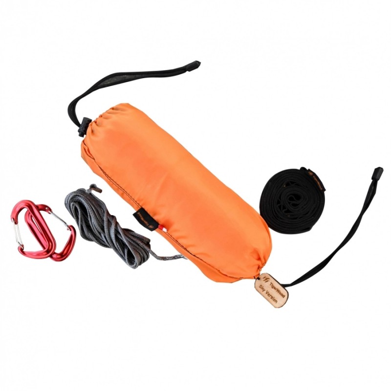 Jeśli szukasz ultralekkiego hamaka i nie chcesz przejmować się kompletowaniem zestawu niezbędnych do jego rozwieszenia akcesoriów, TigerWood Sky Version to zdecydowanie wybór dla Ciebie. Ten ważący jedynie 480 g komplet składa się z niemal nieodczuwalnego w bagażu nylonowego hamaka, niezwykle wygodnych w obsłudze taśm oraz karabińczyków, dzięki czemu szybko przygotujesz miejsce wypoczynku bez konieczności użycia jakichkolwiek węzłów.