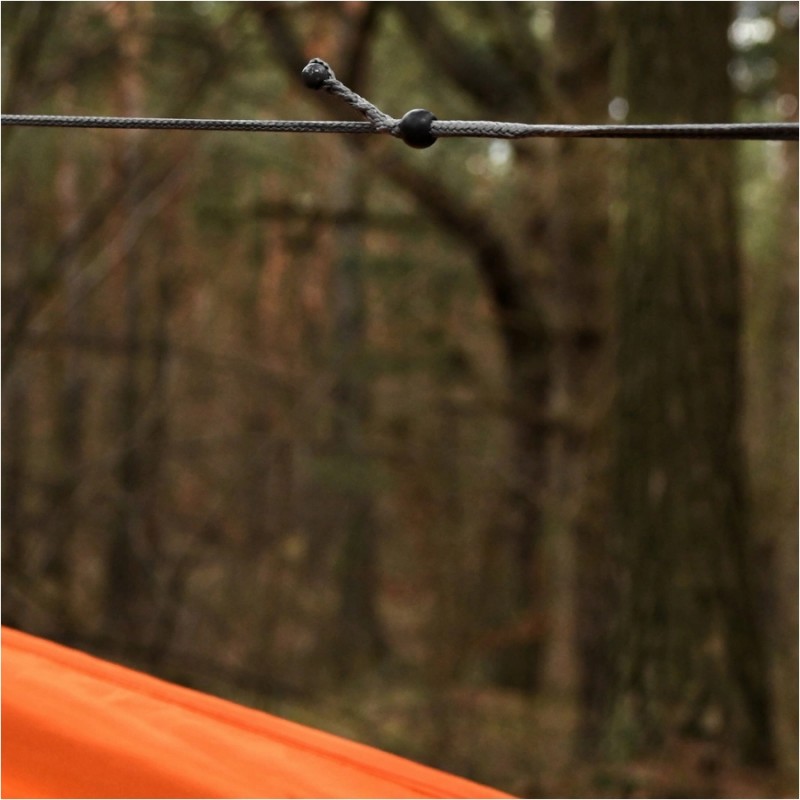 Sky Version to jednak nie tylko hamak, ale również mnóstwo akcesoriów niezbędnych do jego wygodnego i szybkiego rozwieszenia. W ramach zestawu znajdziemy taśmy, które dzięki linii pętli gwarantują możliwość bezwęzłowego rozwieszenia oraz regulacji pozycji hamaka. Dołączone karabińczyki wykonane są z aluminium, a ich konstrukcja sprawia, że są w stanie utrzymać do 300 kg obciążenia – przewyższają zatem odpornością materiał hamaka, gwarantując tym bezpieczeństwo podczas snu. Umieszczone w zestawie linki whoopie sling umożliwią precyzyjną regulację naciągu oraz kąta nachylenia hamaka, natomiast cięciwa pozwoli na odpowiedni rozkład napięcia, sprawiając, że wypoczynek będzie jeszcze bardziej komfortowy.