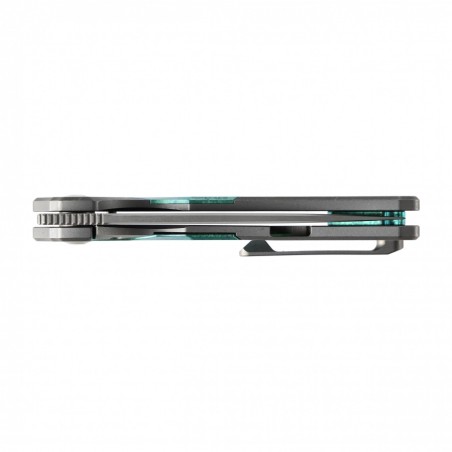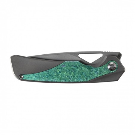 Rękojeść noża Kizer Topsail została wykonana z tytanu, wzbogaconego o wyjątkowe wstawki z tytanu krystalizowanego, które nadają mu unikalny, niemal biżuteryjny charakter. Każdy egzemplarz ma subtelnie inny wzór, dzięki czemu każdy nóż jest jedyny w swoim rodzaju. Tytan nie tylko zachwyca wizualnie, ale też oferuje niezwykłą odporność na zużycie i korozję przy minimalnej wadze. Ergonomiczne linie zapewniają pewny chwyt, a perfekcyjnie dopasowane kontury sprawiają, że Topsail leży w dłoni jak rzeźbiony pod użytkownika.