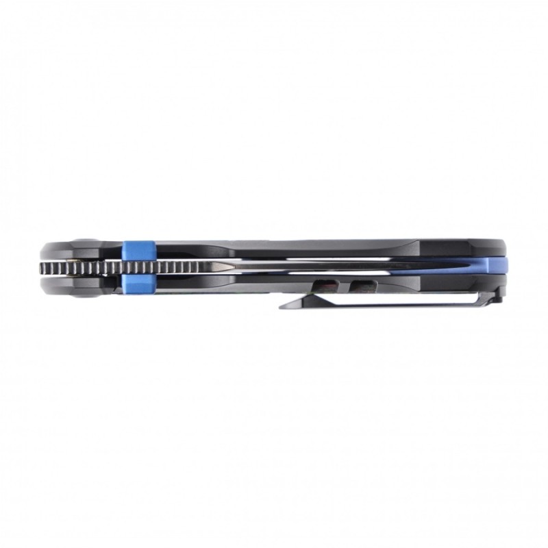 Tytanowa rękojeść z frezowaniami dobrze trzyma się dłoni, a blokada frame lock trzyma ostrze sztywno i składa się płynnie, kiedy kończysz zadanie. Klips tip‑up (prawa strona) dba o niskoprofilowe, wygodne noszenie w kieszeni. Całość działa gładko i sprężyście, więc każdy „klik” przy otwarciu jest równie satysfakcjonujący, co pierwszego dnia.