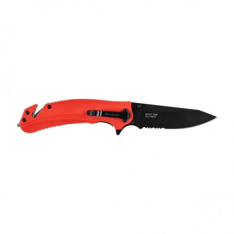 Nóż Kershaw Barricade 8650 Serrated to udane połączenie składanego noża z narzędziem ratunkowym, zaprojektowane specjalnie z myślą o sytuacjach awaryjnych. Zastosowano w nim częściowo ząbkowane ostrze ze stali 8Cr13MoV, przeznaczone do cięcia lin i taśm. Dodatkowo w rękojeści umiejscowiono zbijak do szyb z węglików spiekanych oraz przecinak do pasów. Pomarańczowa i ergonomiczne zaprojektowana rękojeść z nylonu wzmocnionego włóknem szklanym (GFN) zapewnia widoczność noża w ekwipunku. Ostrze ma wspomaganie otwieranie dzięki obustronnemu kołkowi oraz flipperowi.