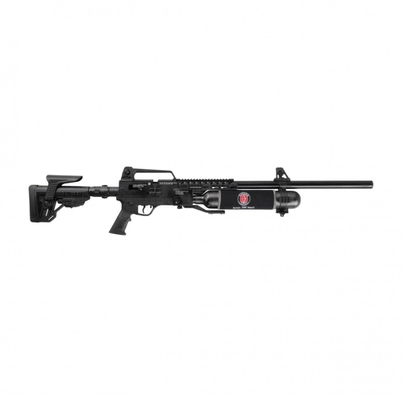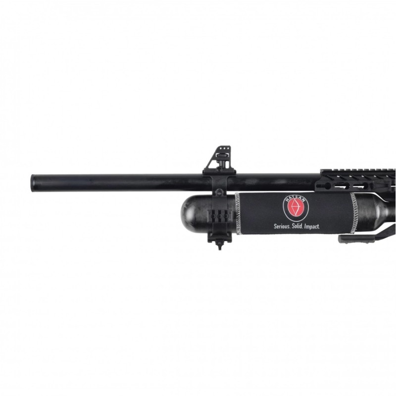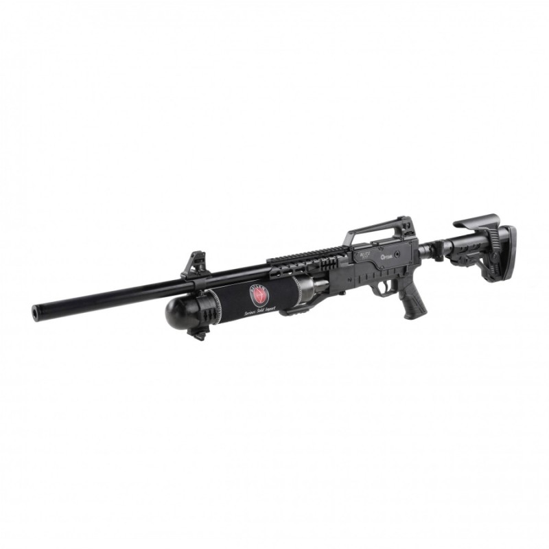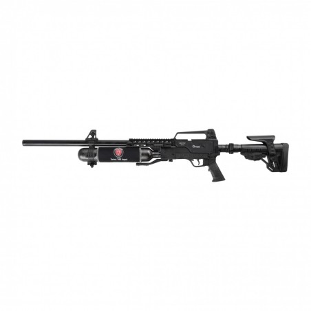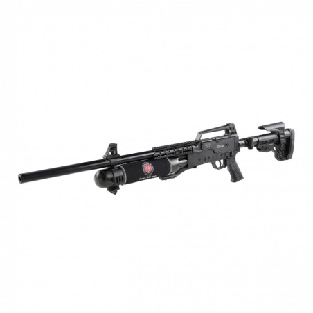 Dokręcany zbiornik o maksymalnym ciśnieniu 300 barów umożliwia kontrolowanie poziomu sprężonego powietrza za pomocą manometru, a regulator stabilizuje energię wylotową, zwiększając precyzję każdego oddanego strzału. W celu zmniejszenia wagi został wykonany z karbonu.
