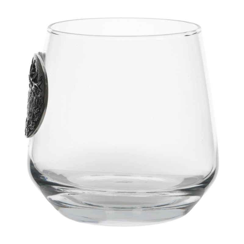 Szklankę ozdobiono mosiężną tabliczką z wizerunkiem głowy byka jelenia. Będzie znakomitym prezentem dla leśnika, myśliwego oraz każdego dorosłego miłośnika mocniejszych trunków.