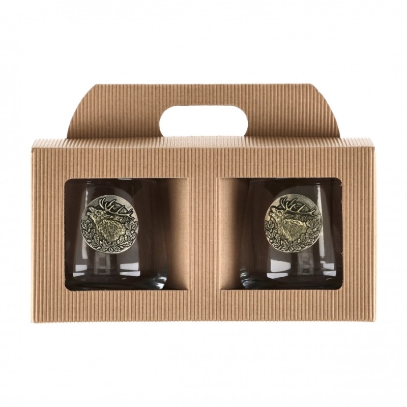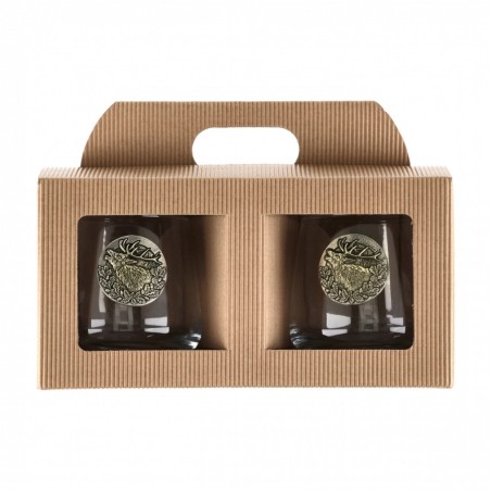 Komplet składa się z 2 wydłużonych szklanek, które ozdobiono mosiężnymi tabliczkami z wizerunkiem samca jelenia. Będzie to znakomity prezent dla leśnika, myśliwego oraz każdego dorosłego zwolennika mocniejszych trunków.