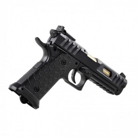 UX 2011 to nowa odsłona legendarnej platformy, która od ponad wieku inspiruje strzelców na całym świecie. Tym razem w wersji rekreacyjnej, dostępnej dla każdego — bez zezwoleń, formalności i ograniczeń. Nowoczesna konstrukcja wzorowana na prawdziwym pistolecie typu 2011 wyróżnia się masywną sylwetką, zamkiem z portingiem oraz efektowną, złotą lufą, które nadają jej sportowego, nowoczesnego charakteru. To właśnie takie detale sprawiają, że sięgasz po UX 2011 nie tylko po to, by strzelać — ale by po prostu mieć go w rękach.