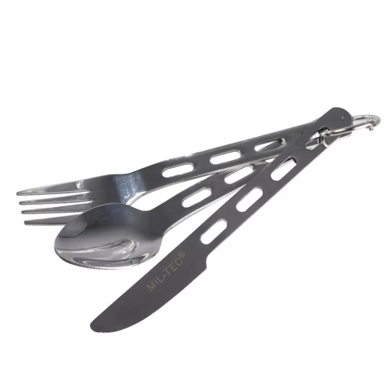 Zestaw składa się z łyżki, ząbkowanego noża i widelca wykonanych w całości ze stali nierdzewnej. Dzięki takiej konstrukcji sztućce są niezwykle trwałe, odporne na życie i korozję oraz łatwe do czyszczenia. Stal nierdzewna jest hipoalergiczna, nie przenosi także smaku i zapachu potraw. Aby zmniejszyć ciężar niezbędnika, rączki sztućców mają szkieletową konstrukcję. Wszystkie elementy stalowego niezbędnika Mil-Tec można spiąć za pomocą metalowego kółka.