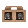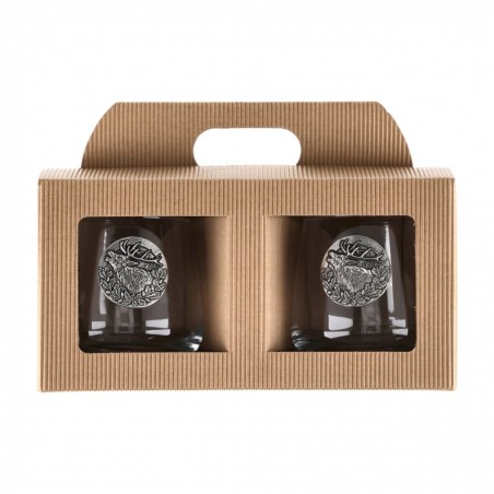 Komplet składa się z dwóch szklanek, które zdobią mosiężne tabliczki z wizerunkiem głowy byka jelenia. Ten zestaw ekskluzywnych szklanek pakowany jest w drewniane pudełko. Będzie to znakomity prezent dla leśnika, myśliwego oraz każdego dorosłego zwolennika mocniejszych trunków.