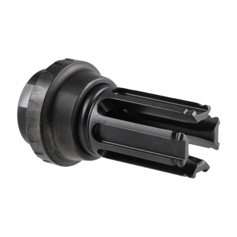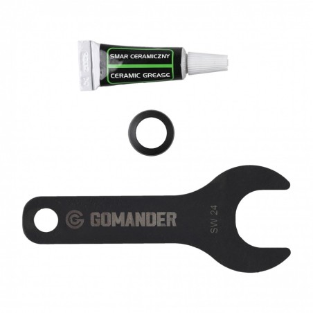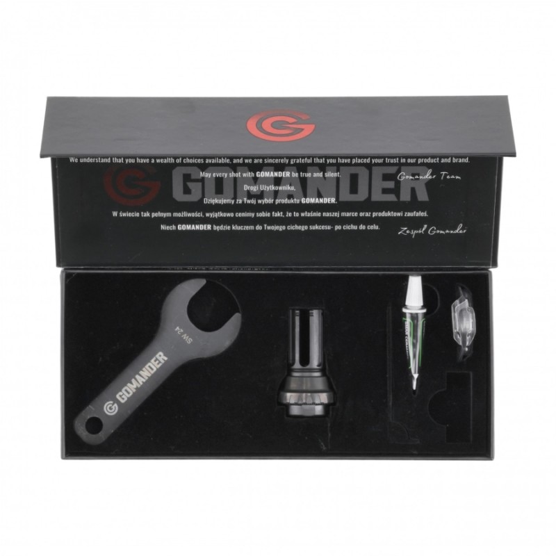 Zawrtość zestawu: kompensator płomienia Gomander Quadron Evo 9 mm 1/2×36, podkładka sprężynująca, nakrętka zabezpieczająca gwint, smar ceramiczny, kluczyk montażowy.