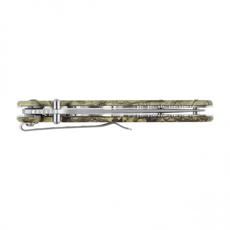 Nóż składany Joker JKR528 z ostrzem wykonanym ze stali nierdzewnej i okładzinami w kamuflażu realtree. W nożu zastosowano blokadę liner lock. W projekcie wyraźnie widać wpływ noży włoskich.