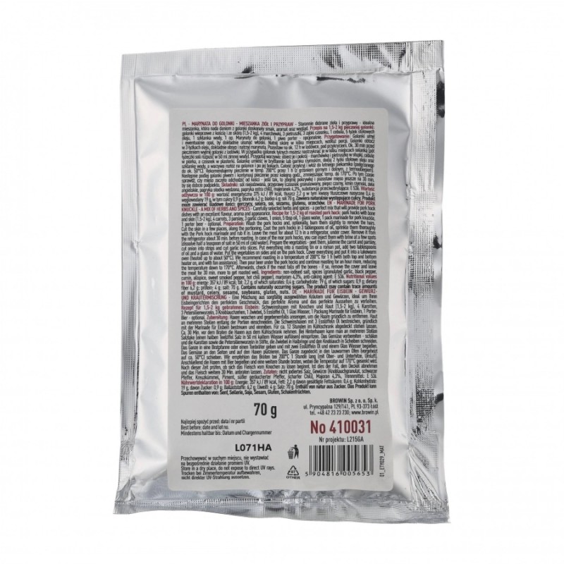 Produkt jest wydajny – jedno opakowanie (70 g mieszanki) wystarcza na przygotowanie około 2 kg pysznych golonek. Marynata jest także łatwa w użyciu – wystarczy natłuścić golonkę olejem i natrzeć mieszanką, aby zioła i przyprawy mogły zacząć działać. Mieszanka jest idealna do różnych metod przygotowania golonki – pieczenia, grillowania i duszenia – dzięki czemu każde danie będzie doskonale przyprawione, zyskując wyborny smak, aromat i apetyczny wygląd.