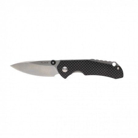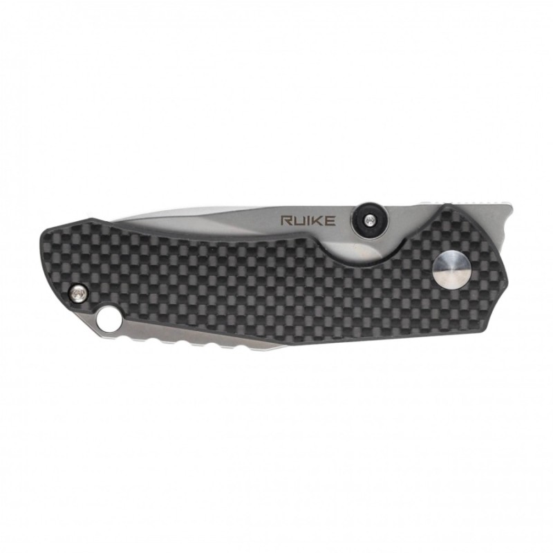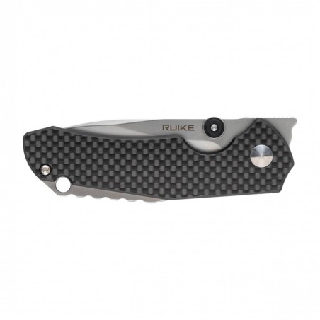 Za komfort operowania nożem odpowiada profilowana rękojeść, którą tworzą okładziny z laminatu G-10 oraz wkładki wzmacniające ze stali 420. Nowoczesną stylistykę podkreślają nakładki z włókna węglowego oraz wystający z rękojeści żebrowany dystanser (backspacer), w którym znajduje się także otwór na linkę lub ozdobny oplot. Profilowany stalowy klips z logo Ruike pozwala na przenoszenie noża na pasie lub w kieszeni.