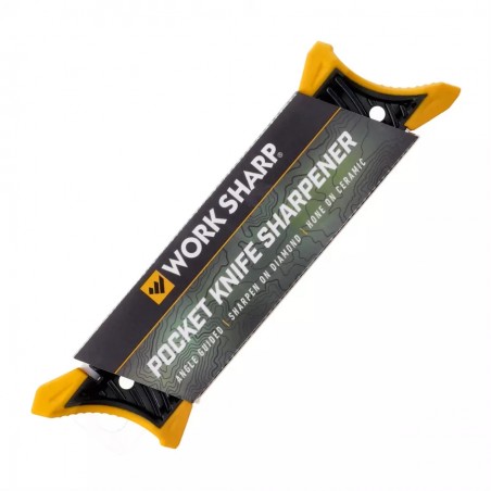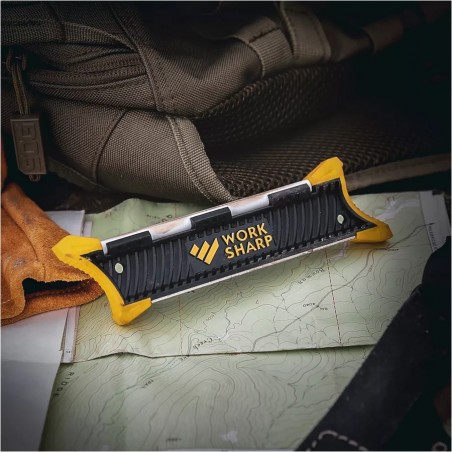 Work Sharp WSGPS to wydajna ostrzałka kieszonkowa, wyposażona w prowadnice o kątach 20° i 25° oraz dwie powierzchnie ostrzące w postaci diamentowej płytki, oraz ceramicznego pręcika.