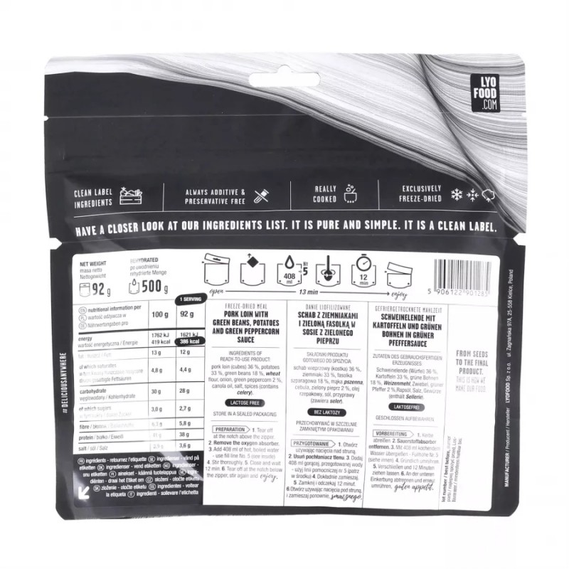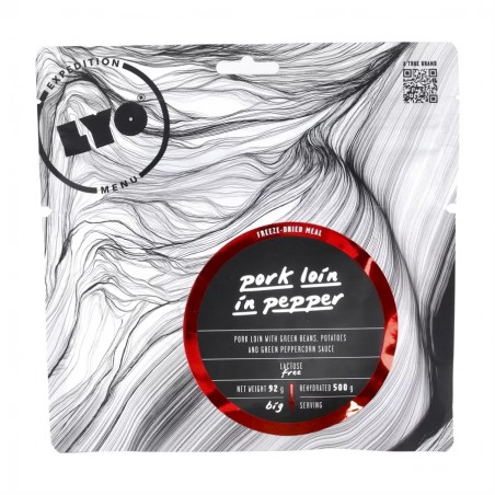 LYOFOOD Schab w zielonym pieprzu (500 g) to liofilizowana wersja dania sprawiającego, że krew w żyłach zacznie płynąć szybciej. Rozgrzewająca porcja delikatnej wieprzowiny w sosie z zielonym pieprzem i ziemniakami to doskonała poprawa dla wielbicieli dobrej, nieco ostrzejszej kuchni.