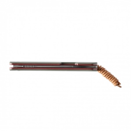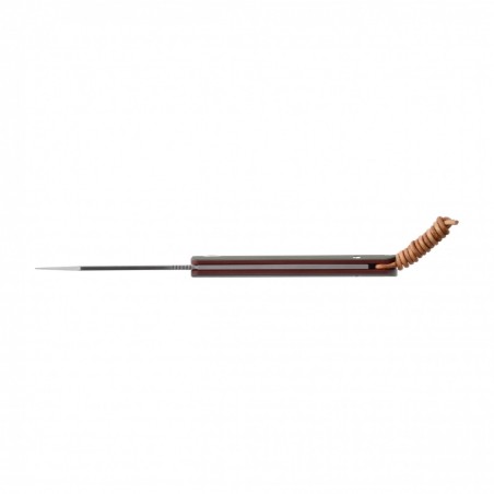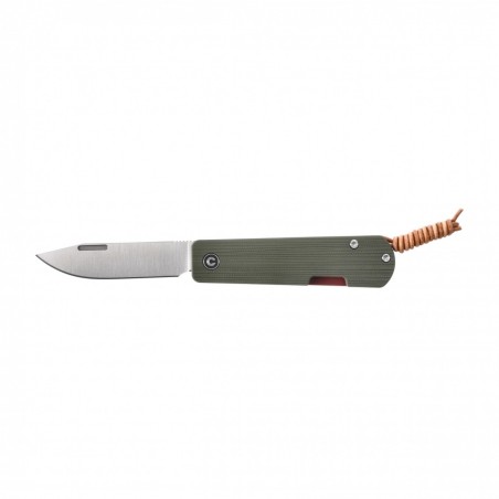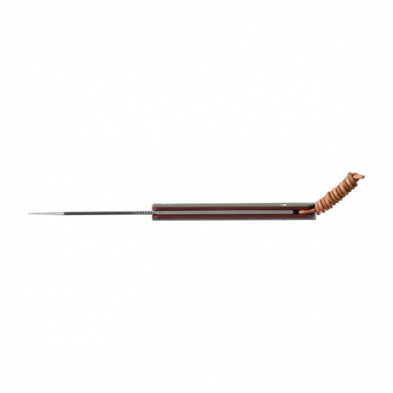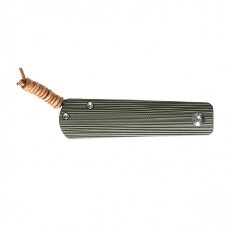 W nożu zastosowano okładziny rękojeści z tworzywa G10. Jest to wytrzymały i lekki kompozyt wykonany z laminatu szklano-epoksydowego. Charakteryzuje się wysoką odpornością na wilgoć, chemikalia i ekstremalne temperatury. Dodatkowo teksturowana powierzchnia przekłada się na pewny chwyt, co dodatkowo zwiększa kontrolę nad nożem podczas użytkowania. Na końcu rękojeści znajduje się otwór na paracord lub smycz.