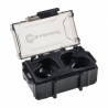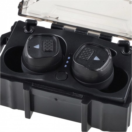 Słuchawki oferują do 10 godzin pracy dzięki dołączonemu etui ładującemu, które pełni również funkcję power banku. Etui ma diodowy wskaźnik poziomu naładowania, a samo ładowanie odbywa się przez port USB-C z gumową zaślepką. Ochronniki informują użytkownika dźwiękowo o niskim poziomie naładowania, co zwiększa wygodę użytkowania w terenie. Poręczne etui do transportu, idealnie dopasowane do większości ładownic Cargo.