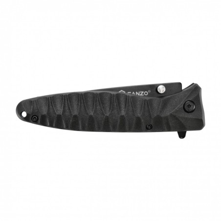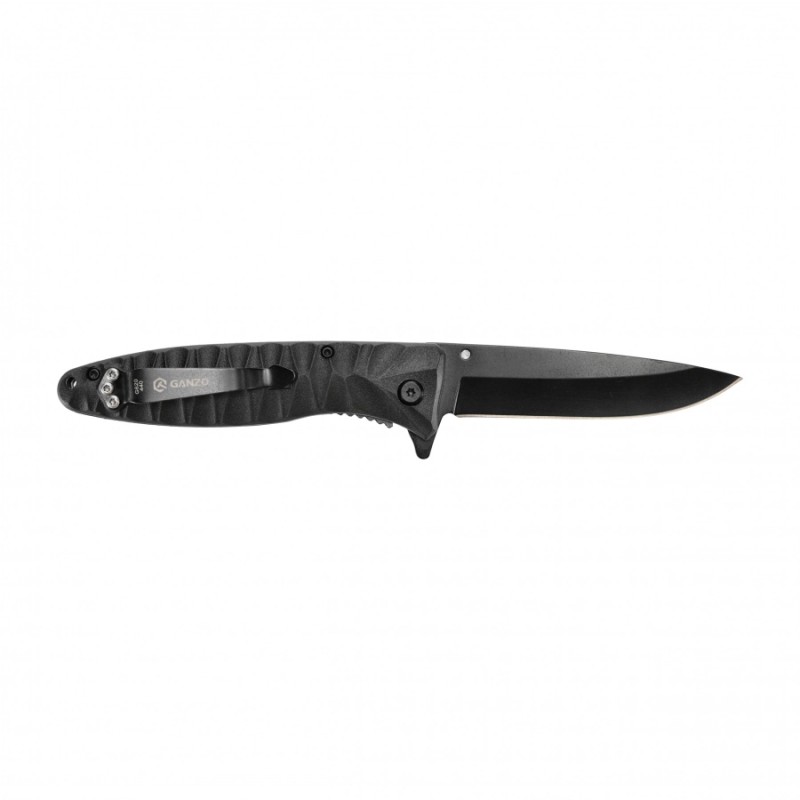 Model Ganzo G620-B1 to nóż posiadający ostrze z czarnym pokryciem oraz teksturowane okładziny rękojeści w kolorze czarnym.