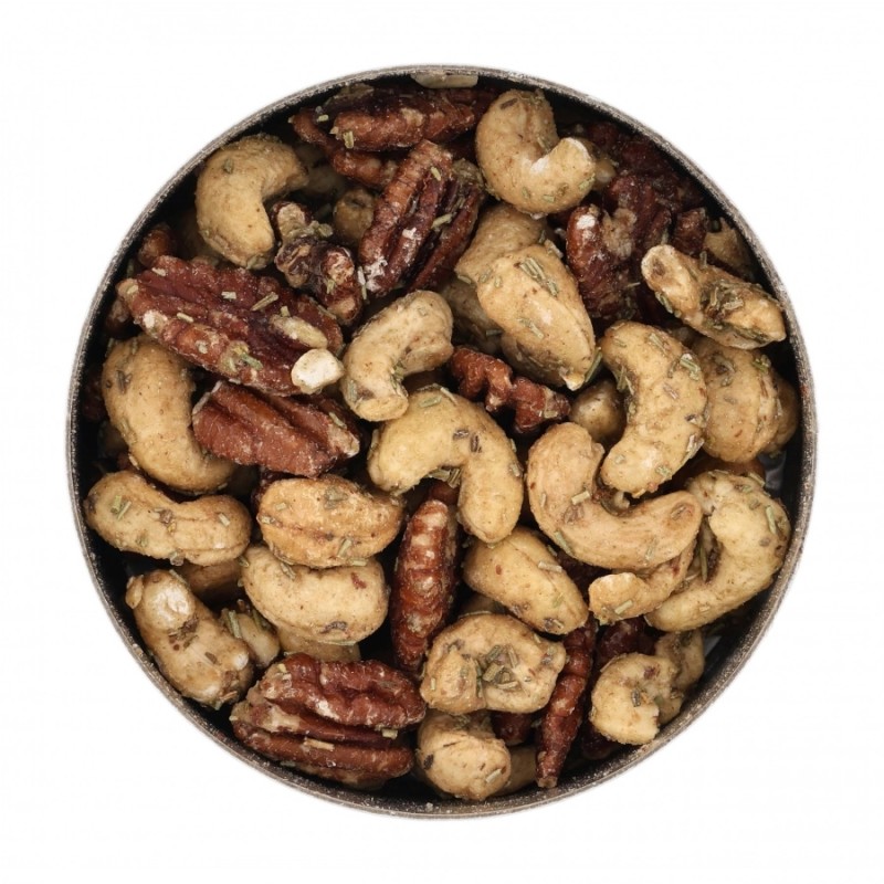 Pieczone orzechy nerkowca i pekan, przyprawiono szczyptą rozmarynu i odświeżającą trawą cytrynową, co sprawia, że ta chrupiąca przekąska jednocześnie uwodzi smakiem i zapachem. Słodkie nerkowce i orzechy pekan wypiekano z dodatkiem różowej soli i aromatycznego rozmarynu wyczarowując w ten sposób istny raj dla podniebienia. Można założyć, że nikt nie skończy na skosztowaniu jednej porcji. Dlatego, jeśli planujecie spotkanie z przyjaciółmi, warto przygotować sobie mały zapas Mixit, oczywiście jedno opakowanie zostawcie dla siebie na czarną godzinę.