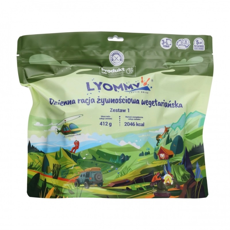 Wegetariańska racja żywnościowa Lyommy — zestaw nr 1 to gotowy, 24-godzinny posiłek stworzony dla najbardziej wymagających użytkowników jak fani bushcraftu, survivalu, trekkingu czy też prepperingu. Pakiet obejmuje aż trzy sycące posiłki bezmięsne oraz deser, stanowiąc solidny fundament energetyczny w sytuacjach awaryjnych lub podczas długich wycieczek i wypadów w las. Dzięki procesowi liofilizacji dania są niezwykle lekkie i kompaktowe i nie tracą pełni smaku oraz wartości odżywczych. Długi termin przydatności i błyskawiczne przygotowanie przy użyciu wody czynią z niej niezawodny element Twojej strategii bezpieczeństwa.