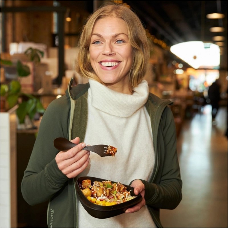 Łyżykowidelec wykonano z biodegradowalnego tworzywa sztucznego na bazie kukurydzy, wolnego od bisfenolu i odpornego na wysoką temperaturę oraz mycie w zmywarkach. Długość 17 cm pozwala także na wygodne spożywanie liofilizatu bezpośrednio z torebki.