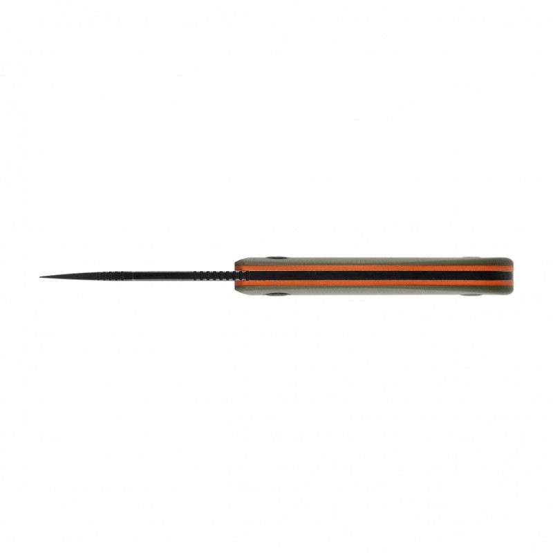 W nożu Kizer Snick zastosowano okładziny rękojeści z tworzywa G10. Jest to wytrzymały i lekki kompozyt wykonany z laminatu szklano-epoksydowego. Charakteryzuje się wysoką odpornością na wilgoć, chemikalia i ekstremalne temperatury. Dodatkowo teksturowana powierzchnia przekłada się na pewny chwyt, co dodatkowo zwiększa kontrolę nad nożem podczas użytkowania. Na końcu rękojeści znajduje się otwór na paracord lub smycz.