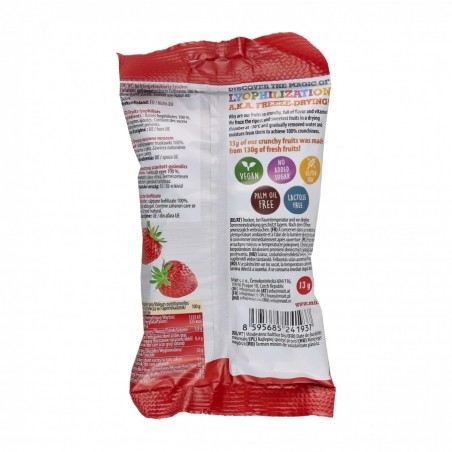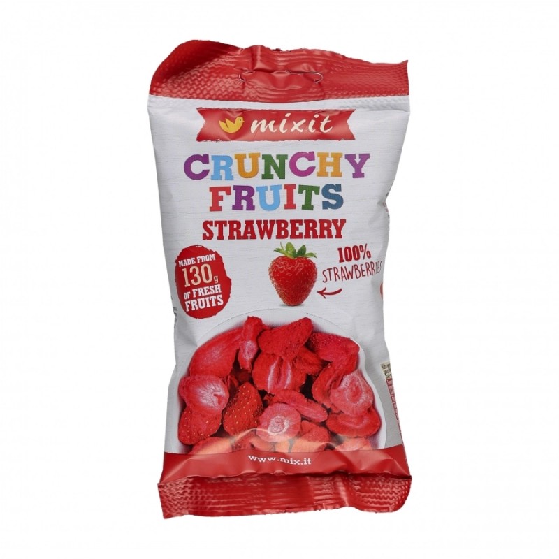 Mixit Chrupiące owoce do kieszeni — truskawka to liofilizowana przekąska owocowa o masie 13 gramów, którą możesz mieć zawsze przy sobie i przechowywać bez użycia lodówki nawet przez kilka miesięcy.