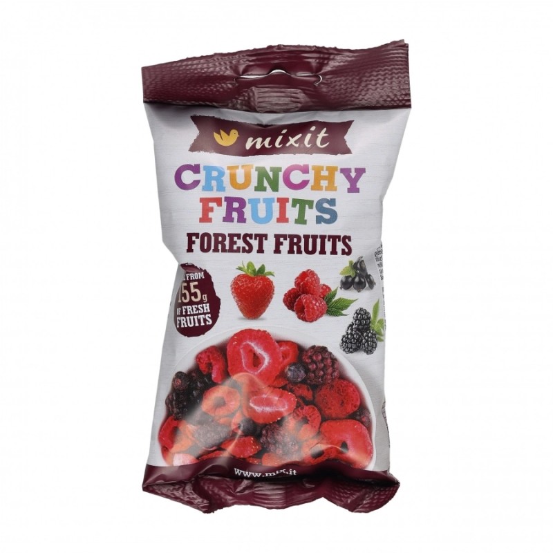 Mixit Chrupiące owoce do kieszeni — mieszanka leśna to liofilizowana przekąska owocowa o masie 20 gramów, którą możesz mieć zawsze przy sobie i przechowywać bez użycia lodówki nawet przez kilka miesięcy.
