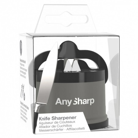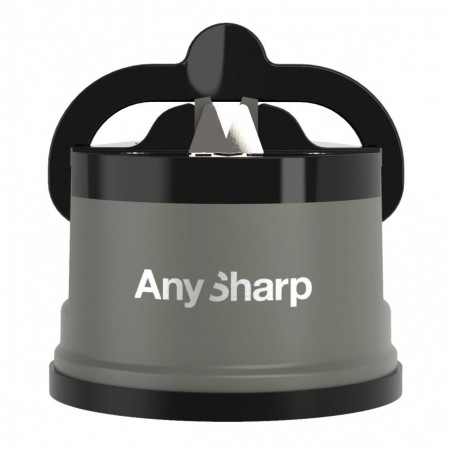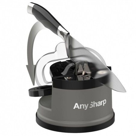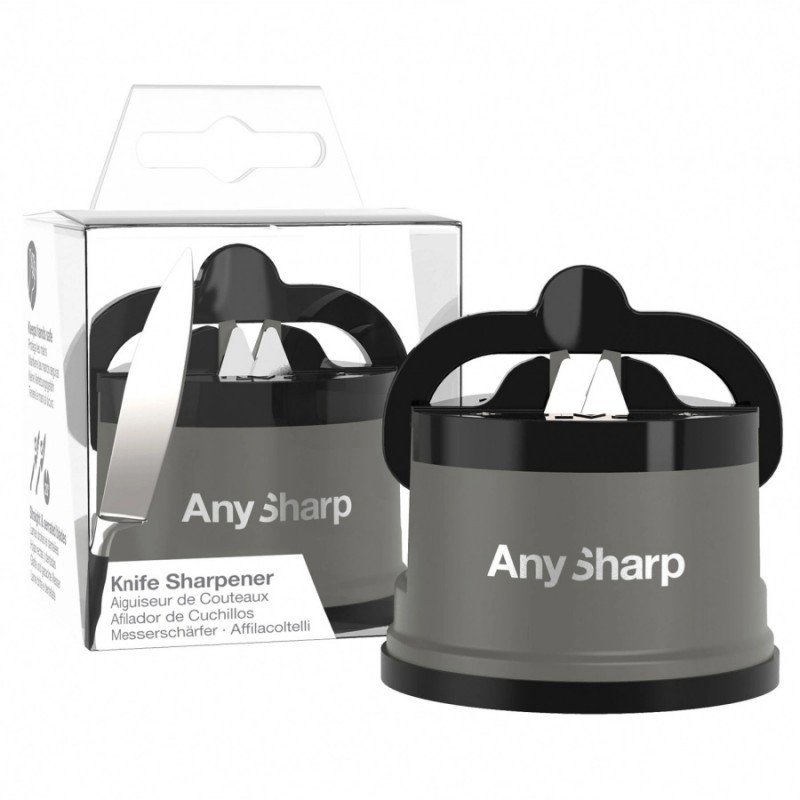 Bardzo skuteczna i prosta w obsłudze ostrzałka do noży. Sekretem ostrzałek AnySharp® są trójkątne płytki ostrzące wykonane z węglika wolframu, który jest niezwykle wytrzymałym materiałem, powstałym wskutek syntezy metalicznego wolframu i węgla w temperaturze do 2000 °C. Twardość tego materiału jest porównywana do diamentu czyli najtwardszego materiału na Ziemi. Właśnie z tego powodu skrawanie ostrza noża jest możliwe i efektywne. Płytki w całości zostały wykonane z węglika wolframu dzięki czemu przewyższają konkurencję żywotnością. Ostrzałka jest wyposażona w gumową przyssawkę z dźwignią PowerGrip®, która zapewnia stabilizację i bardziej precyzyjny proces ostrzenia. Ostrzałka ma prostą konstrukcję z wykończeniem w kolorze szarym.