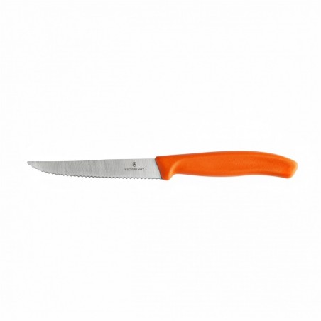 Nóż do steków i pizzy z ząbkami Victorinox ma długą na 11 centymetrów głownię. Jej ząbkowane ostrze pokroi nie tylko miękkie warzywa, ale sprawdzi się doskonale także przy krojeniu mięsa lub pieczywa. Cięcia nie uszkodzą krojonych produktów i pozostawią eleganckie, równe brzegi.