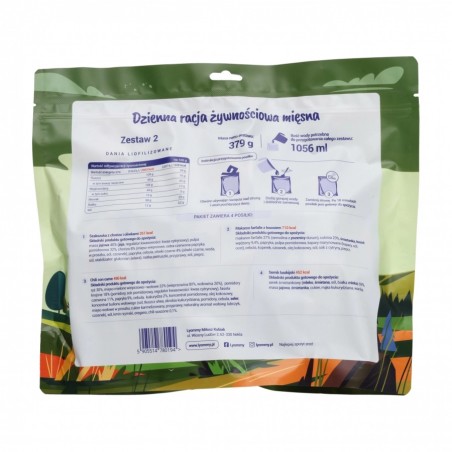 Racja żywnościowa Lyommy — zestaw nr 2 to gotowy, 24-godzinny posiłek stworzony dla najbardziej wymagających użytkowników jak fani bushcraftu, survivalu, trekkingu czy też prepperingu. Pakiet obejmuje aż trzysycące posiłkimięsne oraz deser, stanowiąc solidny fundament energetyczny w sytuacjach awaryjnych lub podczas długich wycieczek i wypadów w las. Dzięki procesowi liofilizacji dania są niezwykle lekkie i kompaktowe i nie tracą pełni smaku oraz wartości odżywczych. Długi termin przydatności i błyskawiczne przygotowanie przy użyciu wody czynią z niej niezawodny element Twojej strategii bezpieczeństwa.