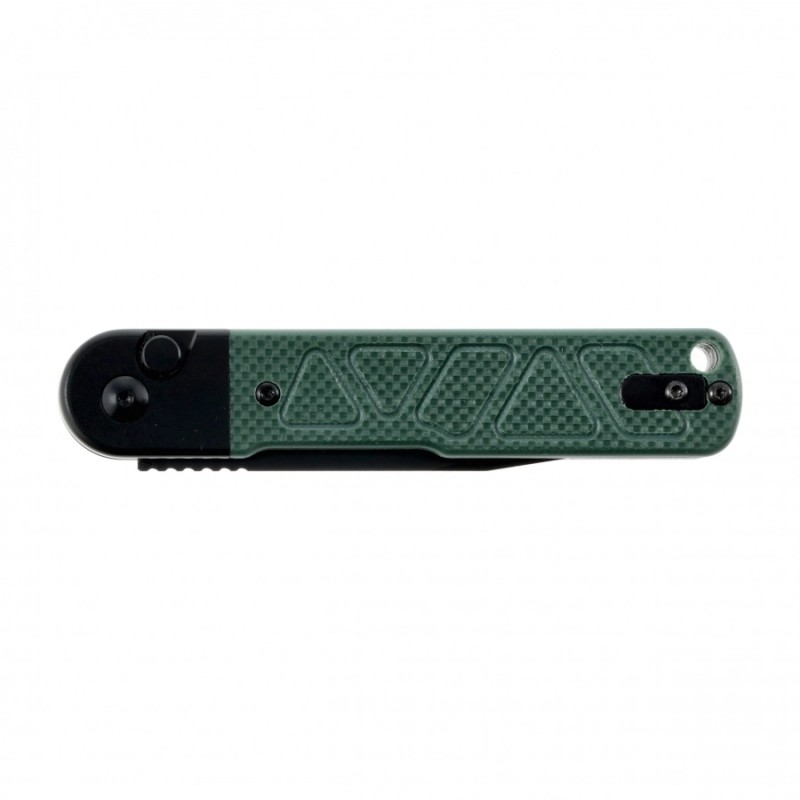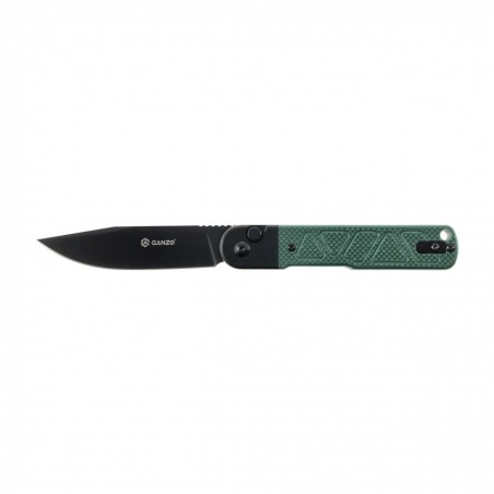 Okładziny rękojeści noża Ganzo G767PT-GB wykonano z barwionego na zielono tworzywa G10. Ten kompozyt z włókna szklanego i syntetycznej żywicy jest lekki i niepodatny na uszkodzenia mechaniczne. Chropowata faktura okładzin sprawia, że nóż dobrze leży nawet w spoconej dłoni. W tylnej części rękojeści znajduje się otwór na linkę lub smycz zabezpieczającą. Producent zadbał także o wygodny transport noża, wyposażając go w klips.