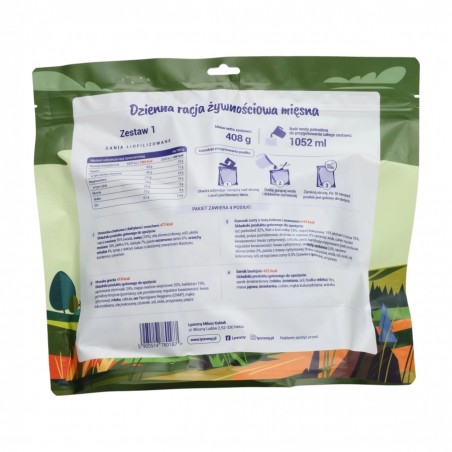 Racja żywnościowa Lyommy — zestaw nr 1 to gotowy, 24-godzinny posiłek stworzony dla najbardziej wymagających użytkowników jak fani bushcraftu, survivalu, trekkingu czy też prepperingu. Pakiet obejmuje aż trzysycące posiłkimięsne oraz deser, stanowiąc solidny fundament energetyczny w sytuacjach awaryjnych lub podczas długich wycieczek i wypadów w las. Dzięki procesowi liofilizacji dania są niezwykle lekkie i kompaktowe i nie tracą pełni smaku oraz wartości odżywczych. Długi termin przydatności i błyskawiczne przygotowanie przy użyciu wody czynią z niej niezawodny element Twojej strategii bezpieczeństwa.