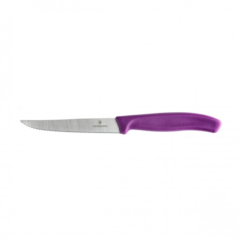 Nóż do steków i pizzy z ząbkami Victorinox ma długą na 11 centymetrów głownię. Jej ząbkowane ostrze pokroi nie tylko miękkie warzywa, ale sprawdzi się doskonale także przy krojeniu mięsa lub pieczywa. Cięcia nie uszkodzą krojonych produktów i pozostawią eleganckie, równe brzegi.