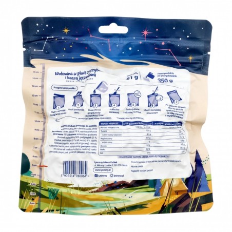 Przewagą dań Lyommy jest ich błyskawiczne przygotowanie – wystarczy zalać liofilizat gorącą wodą, poczekać 10 minut i… gotowe! Danie jest wysokoenergetyczne (335 kcal/porcja), a przy tym pełne białka (35,3 g/100 g) – docenią to wszyscy, którym zależy na regeneracji i odżywieniu podczas wysiłku. Idealne na długie wyprawy, wyjazdy bushcraftowe, rowerowe, survivalowe czy nawet awaryjny obiad w domu. Opakowanie jest ultralekkie (masa netto 81 g), nie zajmuje miejsca w plecaku i nie obciąża bagażu – to doskonały wybór dla wszystkich aktywnych osób!