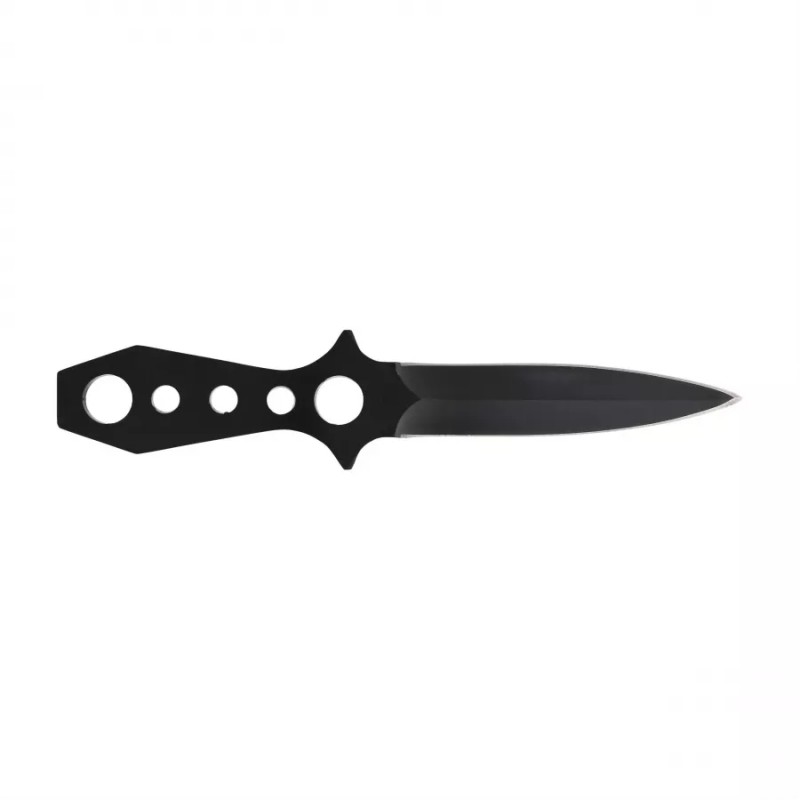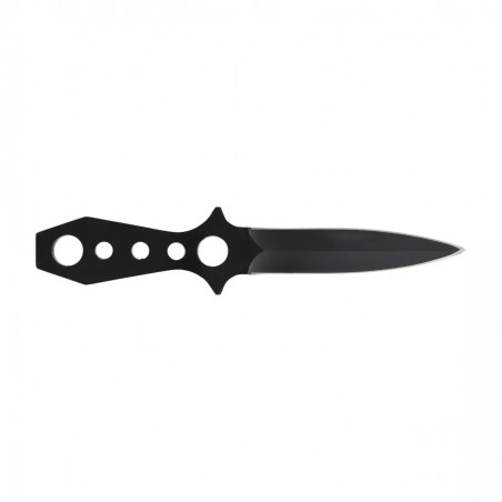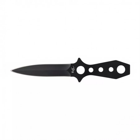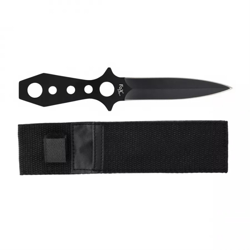 Nóż do rzucania Fox Outdoor w kolorze czarnym to rzutka o konstrukcji Full-Tang. Narzędzie to idealnie sprawdzi się do ćwiczenia celności przy rzucaniu do celu oraz jako niewielki i poręczny nożyk o zastosowaniu bushcraftowo-survivalowym. Nóż jest bardzo dobrze wyważony i wykonano go z jednego kawałka stali. Ostrze jest obustronne i zakończone wydatnym szpicem, umożliwiającym przebicie się przez więkoszość materiałów. Cechą charakterystyczną jest bardzo cienki profil noża, co ułatwia jego przechowywanie. Rękojeść ma konstrukcję ażurową, a samo narzędzie bardzo dobre wyważenie. W zestawie znajduje się nylonowa kabura z zapięciem na rzep.