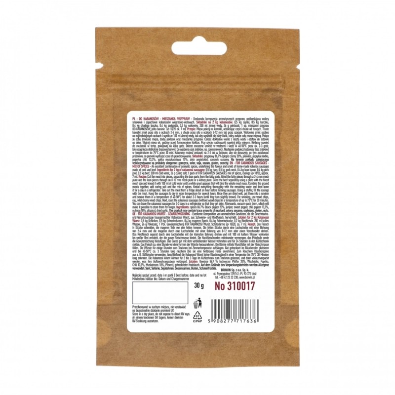 Mieszanka ziół i przypraw Browin do kabanosów to kompozycja stworzona specjalnie dla miłośników smacznej i tradycyjnej polskiej kuchni. Ten 30-gramowy pakiet został opracowany specjalnie z myślą o przyprawieniu domowej produkcji mięsa, z uwzględnieniem braku polepszaczy smaku oraz chemicznych dodatków. Dzięki temu, przyprawa ta zapewnia wyłącznie naturalny smak i przyjemny aromat ziół.