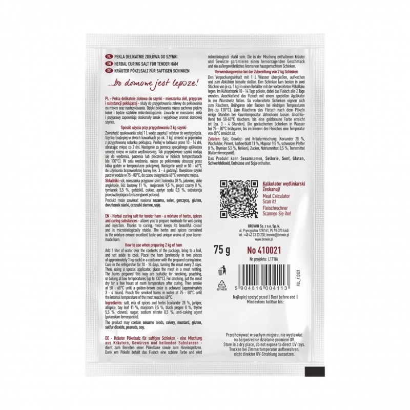 Ziołowa pekla Browin do szynki to kompozycja stworzona specjalnie dla miłośników smacznej i tradycyjnej polskiej kuchni. Ten 75-gramowy pakiet został opracowany specjalnie z myślą o przyprawieniu domowej produkcji mięsa, z uwzględnieniem braku polepszaczy smaku oraz chemicznych dodatków. Dzięki temu przyprawa ta zapewnia wyłącznie naturalny smak i przyjemny aromat ziół.