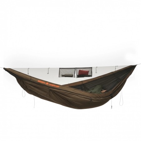 Asymetryczny kształt hamaka umożliwia płaskie i naturalne ułożenie ciała, co znacząco poprawia jakość snu w porównaniu do klasycznych konstrukcji. Underblanket regulowany za pomocą czterech gumek pozwala precyzyjnie kontrolować dopływ powietrza i docisk ociepliny, zapewniając komfort termiczny nawet przy temperaturach sięgających około -5°C, w zależności od zastosowanego śpiwora. System regulacji działa płynnie i pozwala dostosować warunki bez wychodzenia z hamaka.