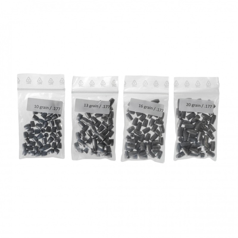 Zestaw testowy ZAN Projectiles zawierający w sobie 200 sztuk ołowianych pocisków kalibru 4,5 mm (.117) typu slug (Breneka) w 4 różnych gramaturach. Przeznaczony do testowania precyzyjnych wiatrówek PCP. Będzie to idealne rozwiązanie dla strzelców pragnących dopasować wagę śrutu do lufy oraz ciśnienia roboczego swojej wiatrówki. Kompletny pakiet różnorodnych śrutów ułatwi Ci takie ich dobranie, aby miało to przełożenie na najlepszą celność oraz stabilny tor lotu pocisku.
