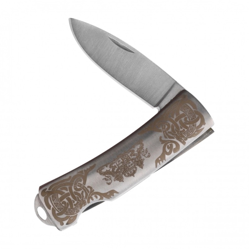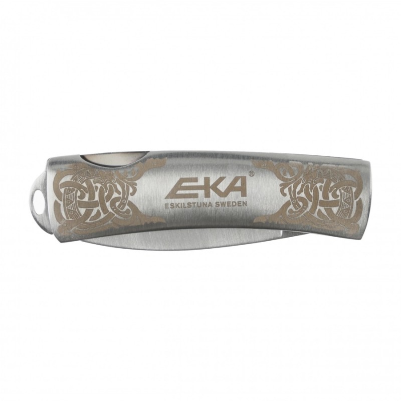 W nożu zastosowano stalową rękojeść z nanesionym grawerunkiem przedstawiającym motywy zwierzęce i roślinne (bazujące na tradycji skandynawskiej), które zostały wybarwiowne na brązowy kolor. Cechą, która podkreśla prestiżowy styl noża jest również wyraźne logo marki EKA. Do noża możesz przypiąć linkę lub paracord.