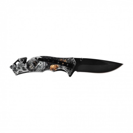 Wykonana z nierdzewnej stali, długa na 85 mm i pokryta antykorozyjną farbą klinga pomoże przygotować posiłek, wystrugać coś, okorowywać gałąź lub batonować drewno na rozpałkę. Uwagę zwraca interesujący motyw, którym przyozdobiono rękojeść – leśny plener z wyobrażeniem niedźwiedzia i drapieżnego ptaka.