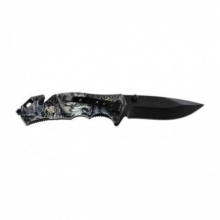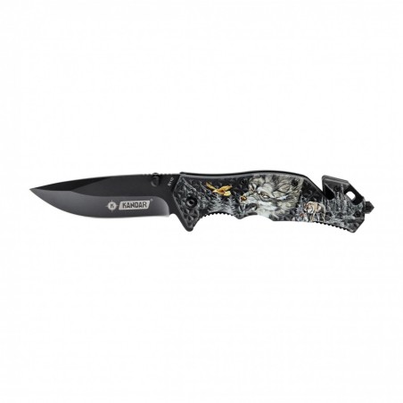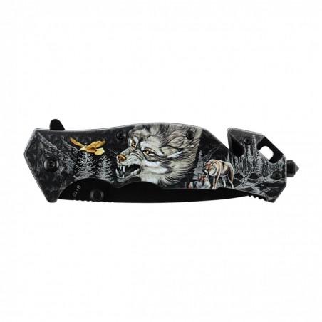 Z pomocą wykonanej z nierdzewnej stali, długiej na 85 mm i pokrytej antykorozyjną farbą klingi można przygotować posiłek, wystrugać coś, okorowywać gałąź lub batonować drewno na rozpałkę. Uwagę zwraca interesujący motyw, którym przyozdobiono rękojeść – leśny plener z wyobrażeniem wilka i drapieżnego ptaka.