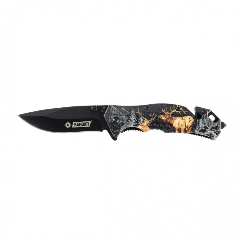 Kandar N379 to składany nóż edc, wyposażony w głownię ze stali nierdzewnej 440, profilowane okładziny z tworzywa sztucznego, ostrze do cięcia pasów bezpieczeństwa oraz awaryjny zbijak do szyb.