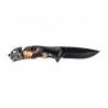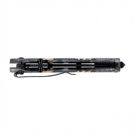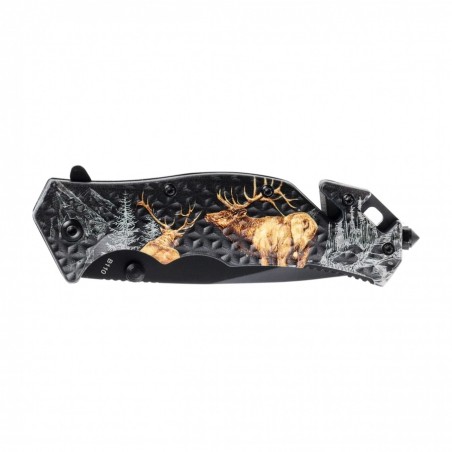 Nóż ma lekki okładziny z polimeru zdobione myśliwską grafiką. Szeroki chwyt, głębokie podcięcie na palec wskazujący oraz drobne teksturowanie powoduje, że nóż pewnie i wygodnie leży w dłoni. Dyskretne przenoszenie noża w kieszeni umożliwia wysoko osadzony klips (bez możliwości przełożenia).