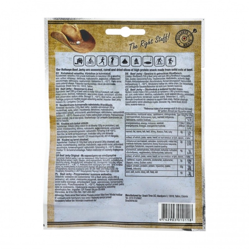 Suszona wołowina Bullseye Meats Beef Jerky Original o wadze 25 g to idealna przekąska dla osób prowadzących aktywny tryb życia. Dzięki zastosowaniu unikalnych marynat charakteryzują ja wyjątkowy, wyrazisty smak.