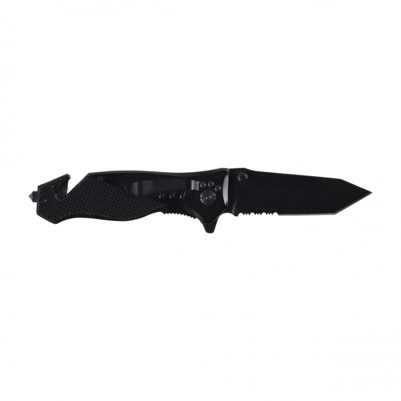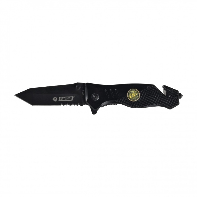 Składany nóż ratowniczy Kandar to solidne narzędzie zaprojektowane z myślą o sytuacjach, w których liczy się szybka reakcja i niezawodność. Wytrzymała, czarna konstrukcja o matowym wykończeniu prezentuje się profesjonalnie i jednocześnie ogranicza refleksy światła. Charakterystyczna głownia z częściowym ząbkowaniem pozwala sprawnie ciąć pasy, liny i inne trudniejsze materiały, co czyni ten model praktycznym wyborem zarówno do samochodu, jak i do codziennego noszenia w terenie.