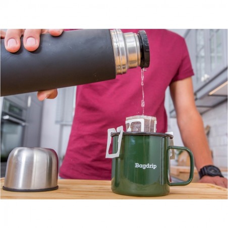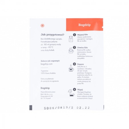 Bagdrip to po prostu jednorazowa saszetka wypełniona naturalną kawą o idealnie dobranej ziarnistości. W torebce, która pełni funkcję filtra, znajduje się świeżo mielona kawa z ziaren z wybranych rejonów świata. Jedna saszetka Bagdrip umożliwia przygotowanie około 185 ml aromatycznej kawy, niemal w każdych warunkach. Przygotowanie napoju jest proste, szybkie i wymaga jedynie kubka, gorącej wody oraz towarzystwa, w którym będziemy delektować się smakiem i aromatem ulubionej kawy.