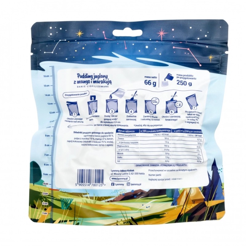 Pudding jaglany z mango i marakują powstał bez dodatku konserwantów oraz ulepszaczy smaku. Danie liofilizowane zawiera naturalne cukry z bananów oraz syropu z agawy.