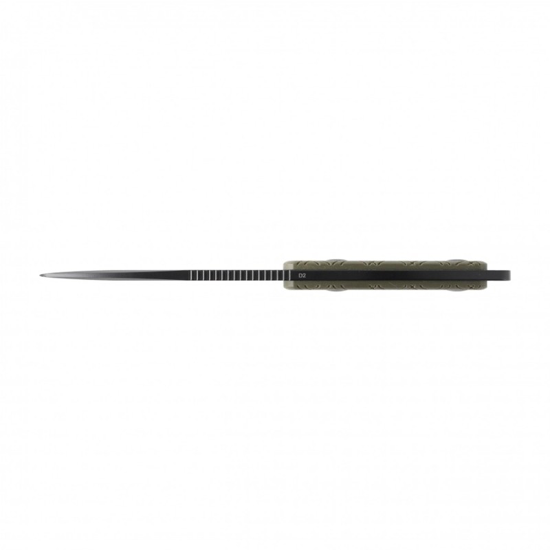 Klingę wykonano z twardej i wytrzymałej stali narzędziowej D2 hartowanej do 60-61 HRC. D2 to stal węglowa o najwyższej odporności na korozję, które niezwykle agresywnie tnie, ma znakomitą retencję (zdolność do trzymania ostrości) i jest wysoce odporna na zużycie i uszkodzenie. D2 to wspaniała alternatywa dla drogich stali premium, ponieważ ma świetne właściwości tnące, jest twarda i wysoce odporna na ścieranie. Jej ostrzenie wymaga sporo pracy i odpowiedniej ostrzałki (najlepiej diamentowej), jednak kompensuje to długie zachowanie krawędzi oraz mniejsza częstotliwość ostrzenia.