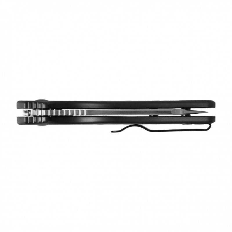 Rękojeść została wykonana z lekkiego i wytrzymałego aluminium, które poddano procesowi czarnej anodyzacji dla zwiększenia odporności na zarysowania. Ergonomiczny, szeroki profil zapewnia pewny i komfortowy chwyt. Wykończenie materiału nadaje całości nowoczesny i elegancki wygląd, a precyzyjne frezowania gwarantują stabilność podczas pracy nożem w trudnych warunkach.